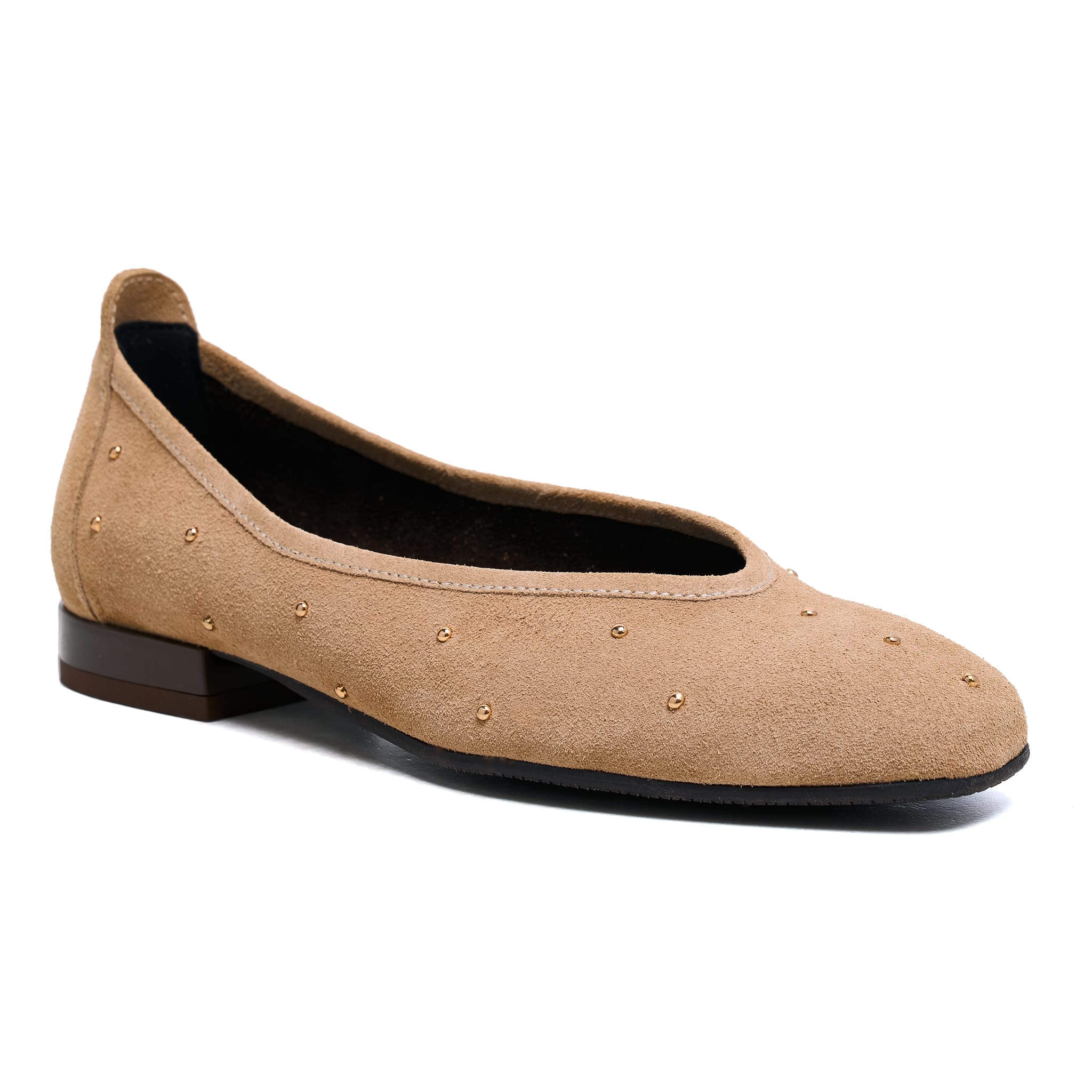 Wsuwana konstrukcja ułatwia zakładanie, a cholewka o tęgości G zapewnia komfortowe dopasowanie do stopy. Model osadzono na elastycznej podeszwie z wysokogatunkowego tworzywa o grubości 0,5 cm, z niskim obcasem o wysokości 2 cm, który delikatnie unosi sylwetkę, nie obciążając stóp. Subtelne ćwieki rozmieszczone na cholewce stanowią dekoracyjny akcent, nadający całości nowoczesnego wyrazu.