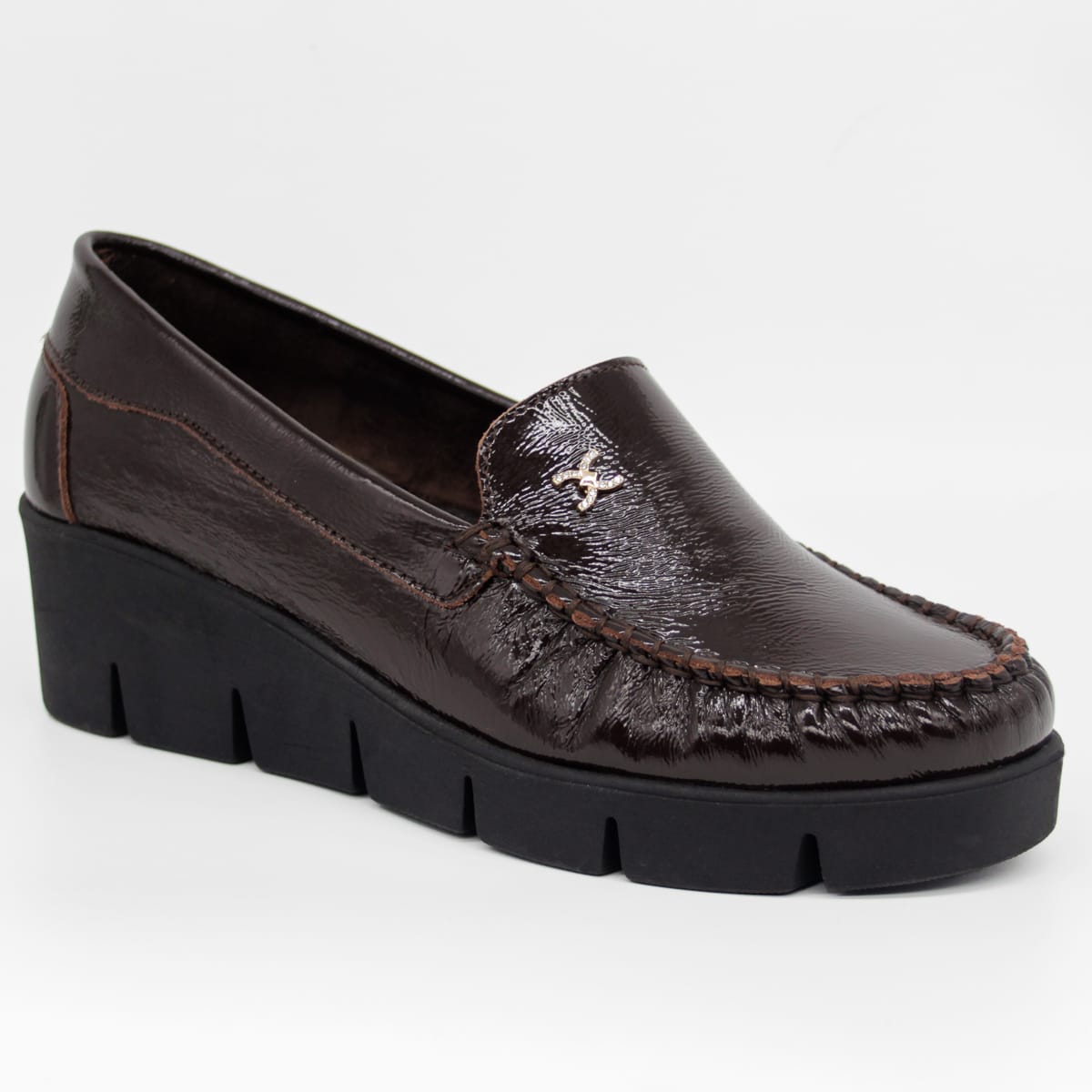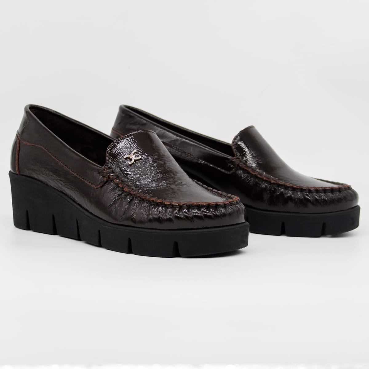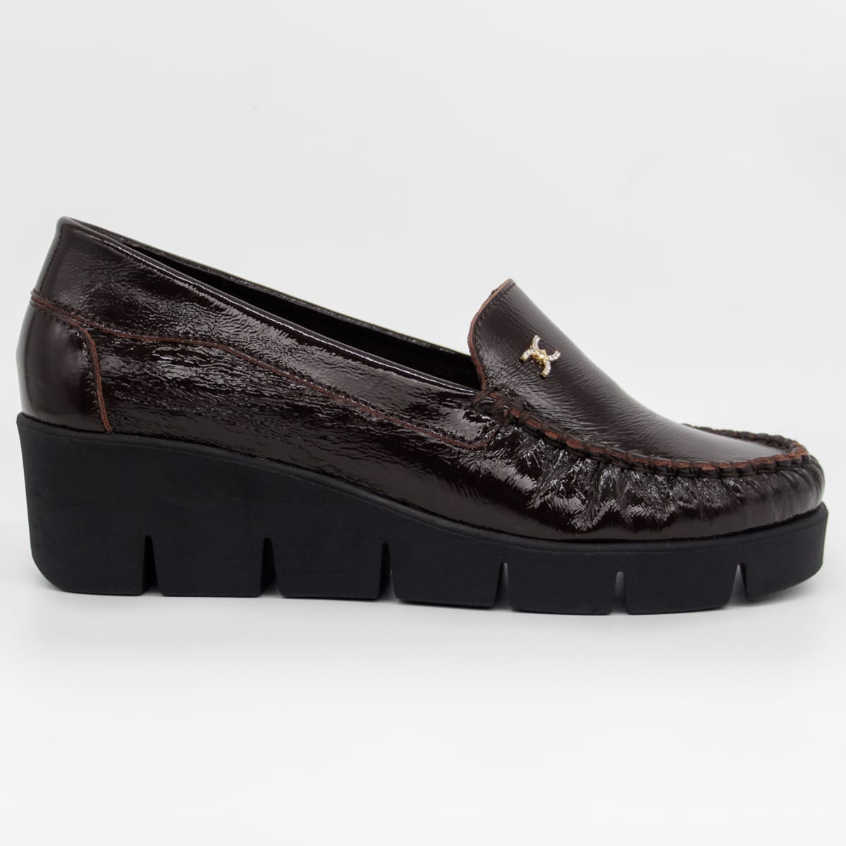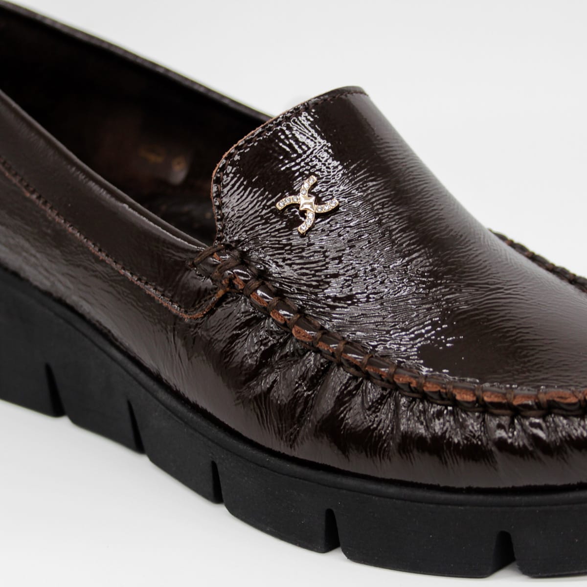Cholewka z naturalnej skóry licowej z delikatnym połyskiem podkreśla estetykę modelu i sprawia, że obuwie zachowuje swój atrakcyjny wygląd przez długi czas. Dekoracyjna broszka z cyrkoniami stanowi efektowny, biżuteryjny detal, który przyciąga wzrok i nadaje mokasynom kobiecego charakteru. Koturn o wysokości 5 cm subtelnie unosi sylwetkę i poprawia proporcje, pozostając wygodną alternatywą dla klasycznych obcasów. Grubość podeszwy 2 cm zapewnia stabilność i komfort podczas chodzenia.